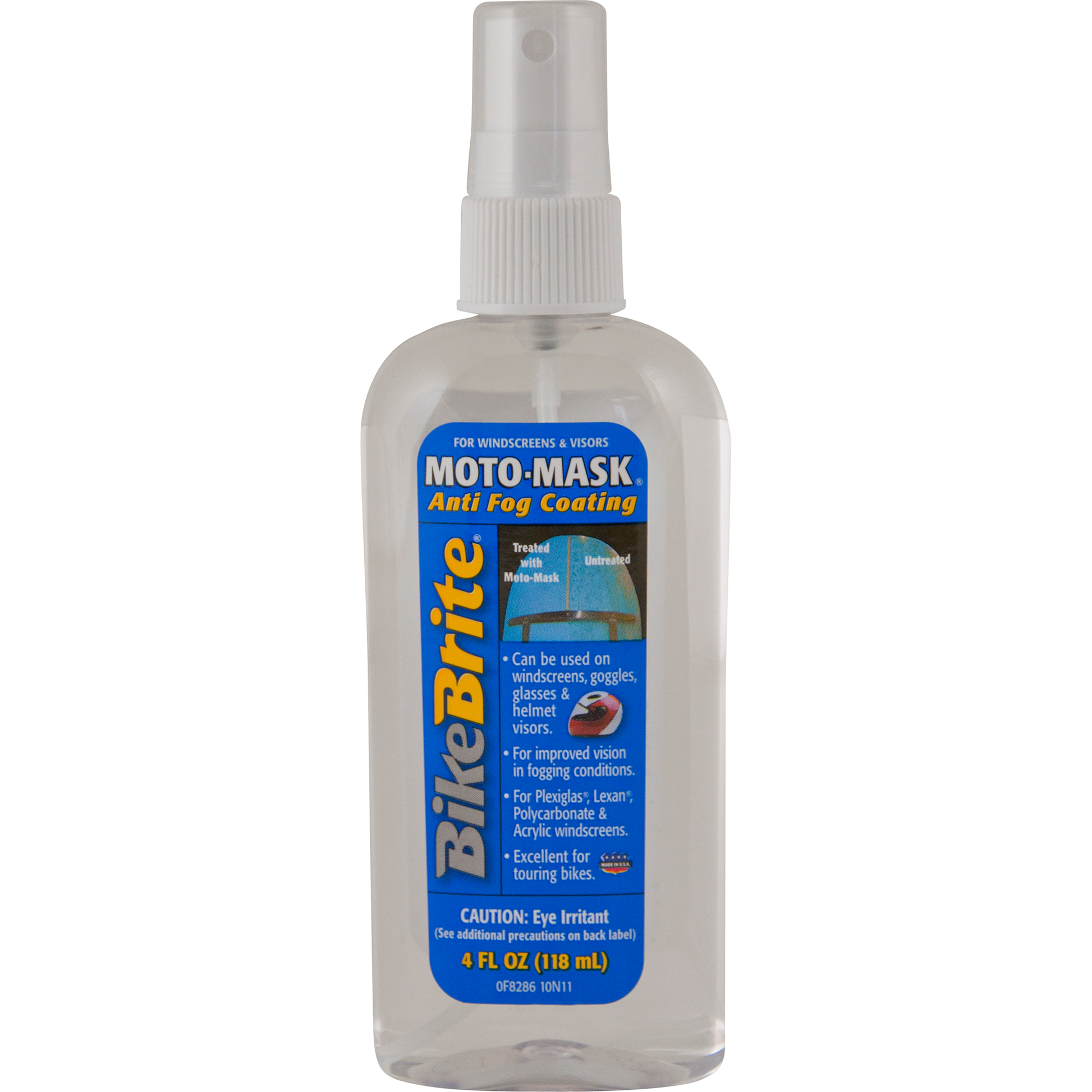 Bike Brite's® Moto Mask® Anti-Fog Coating is good for windscreens, visors, goggles and more. Improves vision on a fogging windscreen due to adverse weather conditions. Can be used on Plexiglas®, Lexan®, Polycarbonate and Acrylic windscreens. Just spray on surface wipe gently to cover entire area and let dry. Great for Touring Bikes. Store away on your Motorcycle as a safety product and add to your roadside safety kit. Made in the U.S.A.